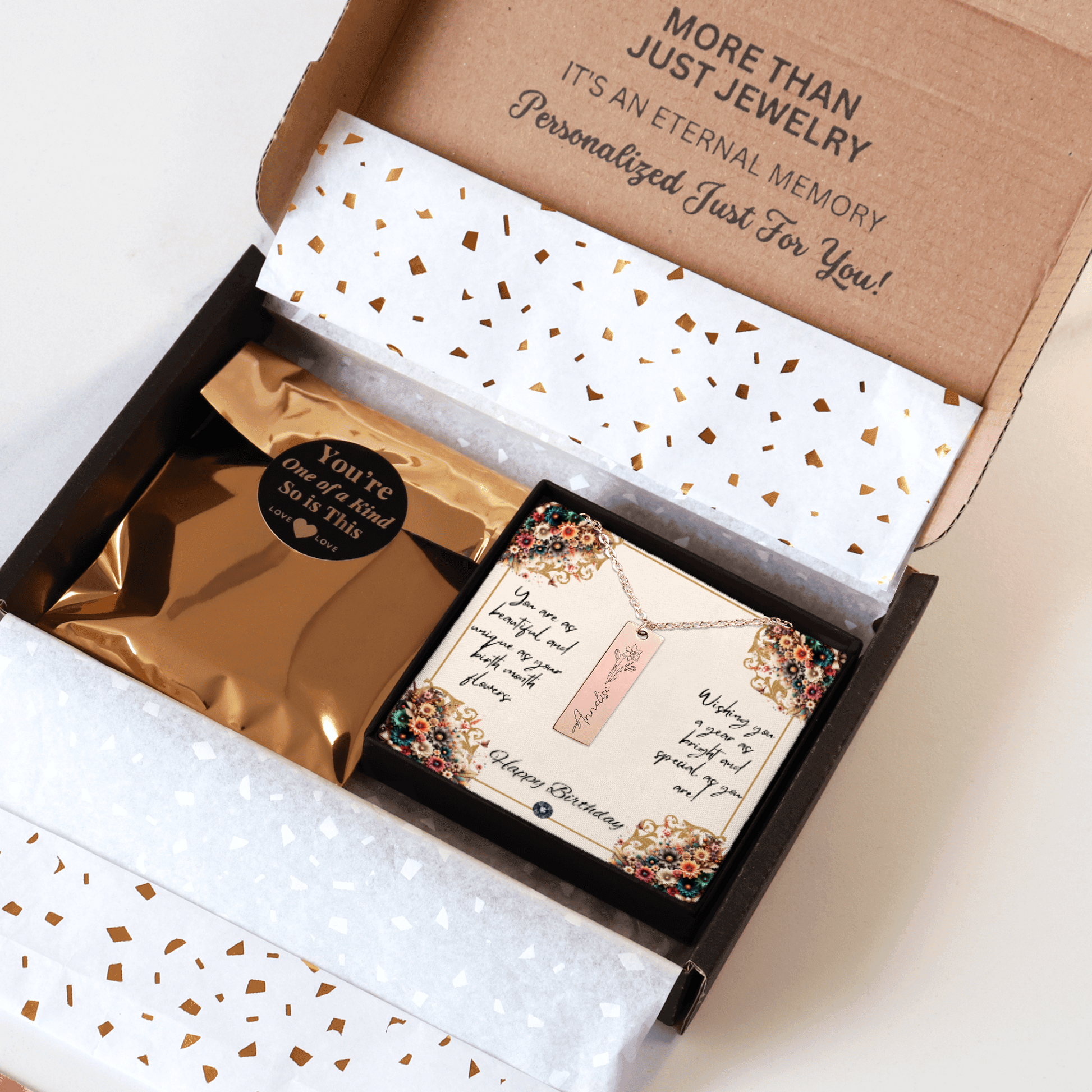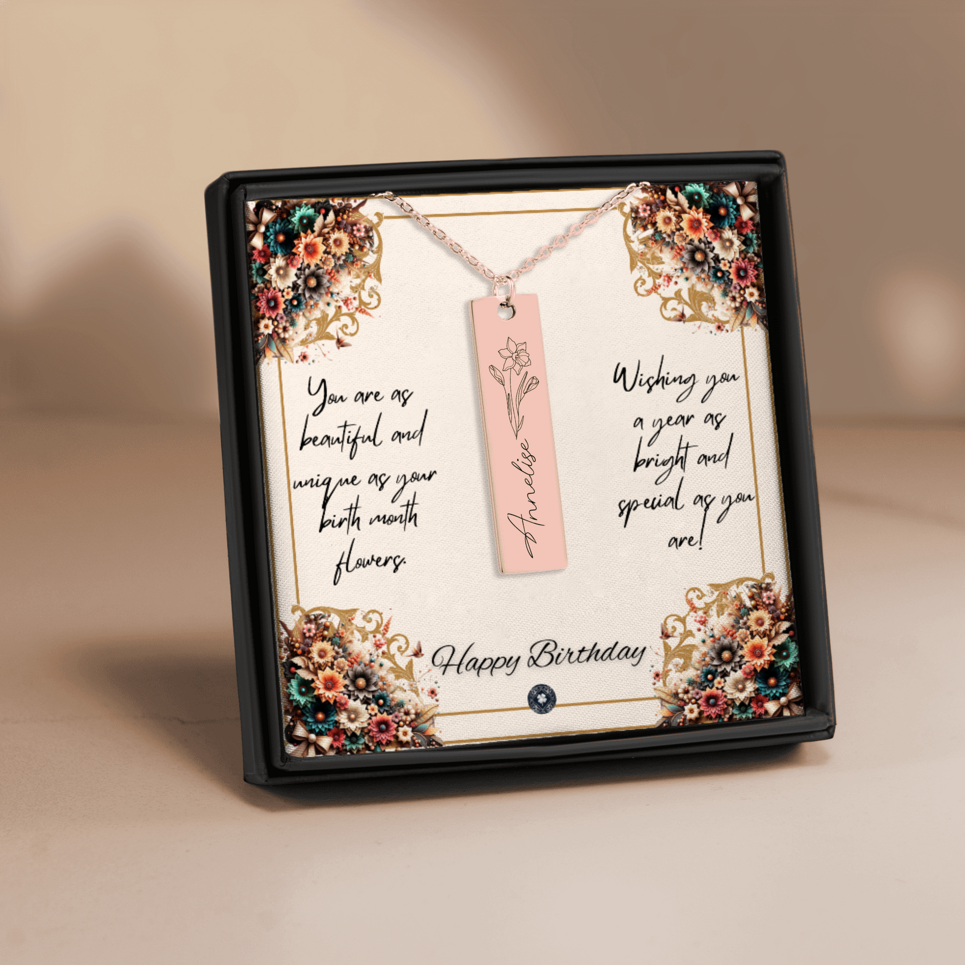 Celebrate your personal story with our exquisite Flower Name Necklace, a graceful piece that beautifully combines a customized birth flower with your chosen name. Featuring delicate, customizable lettering of up to 10 characters, this necklace offers a perfect harmony of meaning and elegance. Available in a polished stainless-steel finish or an 18-karat yellow or rose gold finish, it embodies timeless sophistication. The 9 mm lobster clasp ensures a secure and adjustable fit, making this necklace an ideal everyday adornment or heartfelt gift. Honor your unique journey~ because beauty blooms where love and individuality intertwine. Each necklace in our collection arrives beautifully presented in an elegant dual-tone jewelry box, featuring a plush flocked fleece lining that exudes sophistication and high-end craftsmanship. Designed to protect and showcase your treasured piece, this exquisite box offers a luxurious unboxing experience that reflects the timeless beauty of the jewelry inside. For select items, an upgraded option is available; a stunning mahogany-style wooden box lined with upscale felt material, complete with a built-in LED light that illuminates the pendant in a captivating display. This elevated presentation transforms your jewelry into a true centerpiece, making it the perfect gift or a treasured keepsake for yourself.