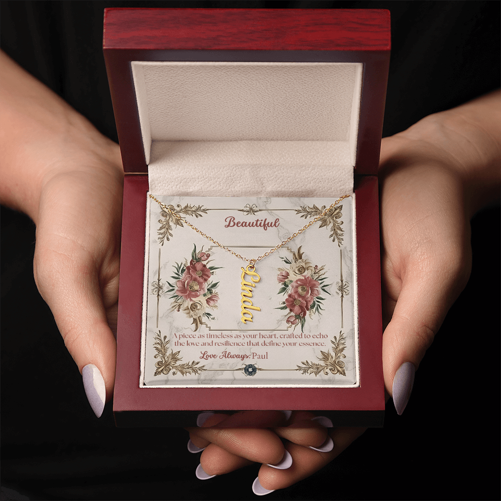 Make your mark with our beautifully customizable Vertical Name necklace, crafted to celebrate your unique story. Featuring elegant cursive writing of up to 10 characters, this piece is available in polished stainless steel or luxurious 18-karat yellow gold finish. Suspended from an adjustable cable chain and secured with a sleek lobster clasp, it offers effortless sophistication and personal meaning. Whether worn as a daily expression of identity or a cherished gift, this necklace embodies timeless style and heartfelt individuality~ because your story deserves to shine.
