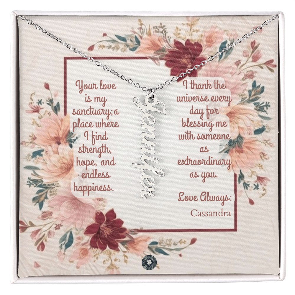 Make your mark with our beautifully customizable Vertical Name necklace, crafted to celebrate your unique story. Featuring elegant cursive writing of up to 10 characters, this piece is available in polished stainless steel or luxurious 18-karat yellow gold finish. Suspended from an adjustable cable chain and secured with a sleek lobster clasp, it offers effortless sophistication and personal meaning. Whether worn as a daily expression of identity or a cherished gift, this necklace embodies timeless style and heartfelt individuality~ because your story deserves to shine.
